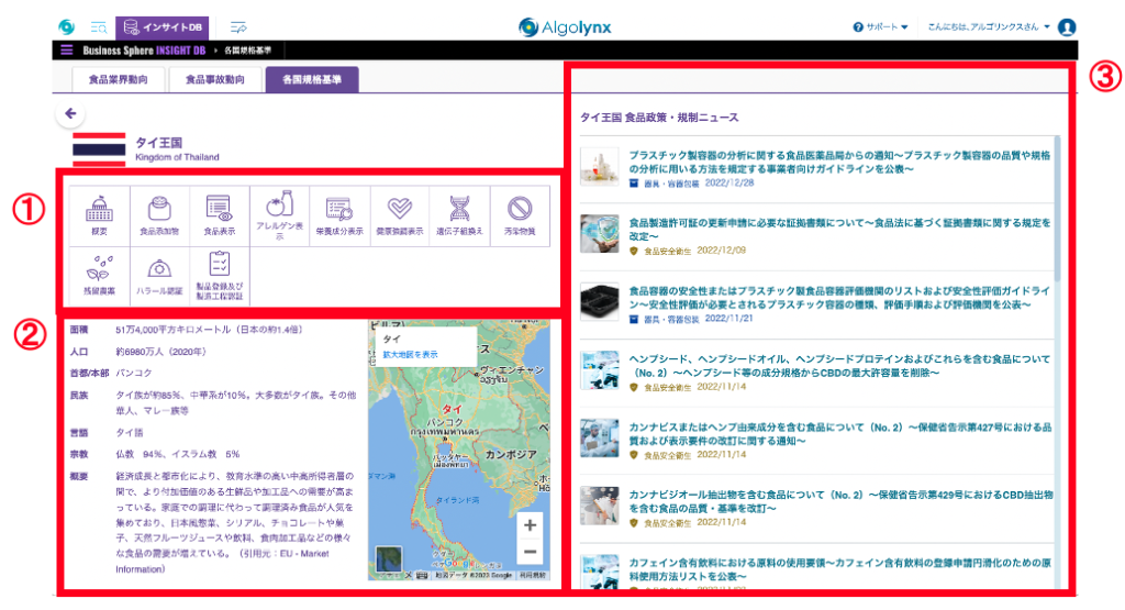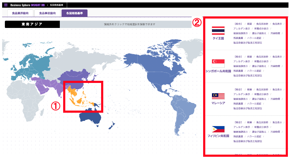 欧州、北米、東南アジア、東アジアほかの20数か国の主要食品規制(全般、食品添加物、食品表示など)の解説、法令文書、最新の改正情報の閲覧が可能です。