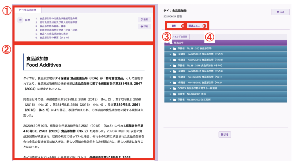 食品添加物、食品表示等の分類ごとに解説、根拠法令が閲覧できます。
